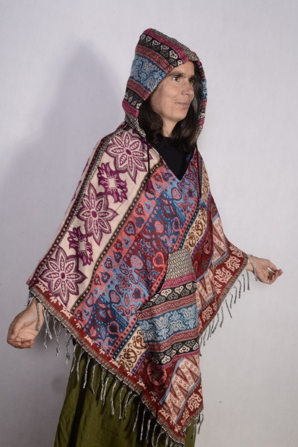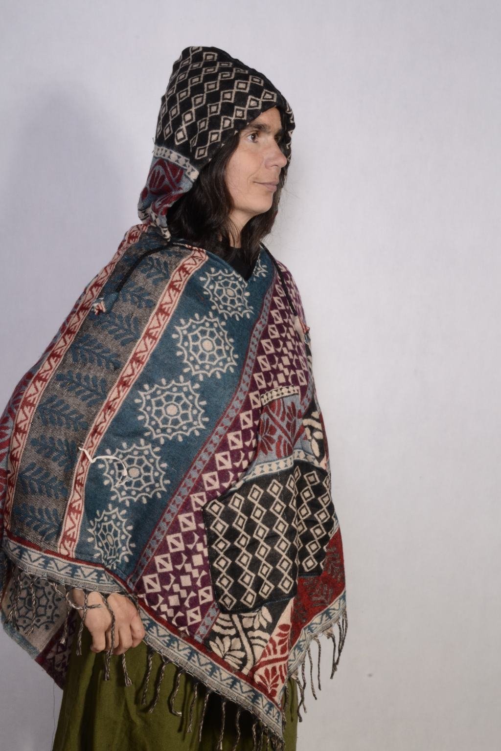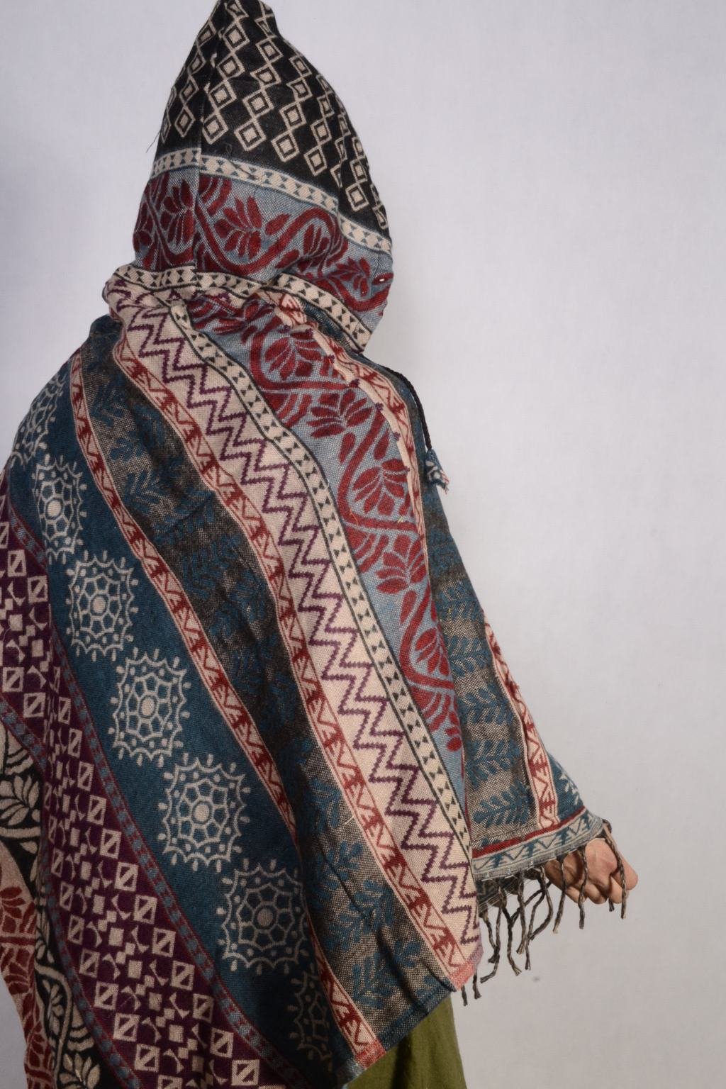 - Pohodlné pončo s kapucí vyrobené z indické deky